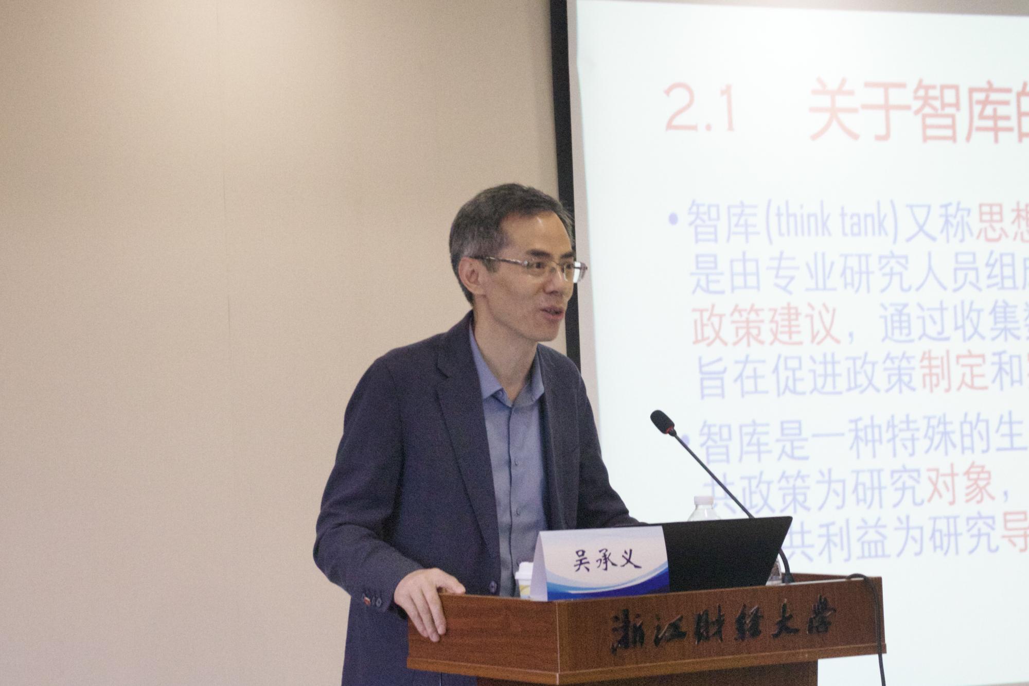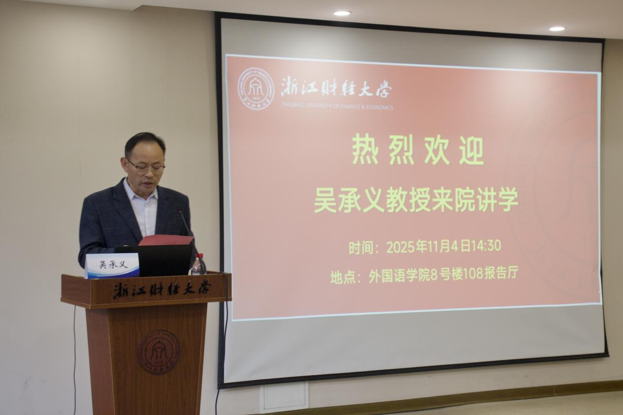 11月4日下午,黑龙江大学吴承义教授应邀为我院师生作了题为“高校外语教师如何做好智库研究”的学术讲座。本次讲座由浙江财经大学外国语学院院长陶久胜教授主持,熊建国副院长参加了活动,余慕鸿教授、毕雪飞教授等部分教师及研究生共同到场聆听学习。