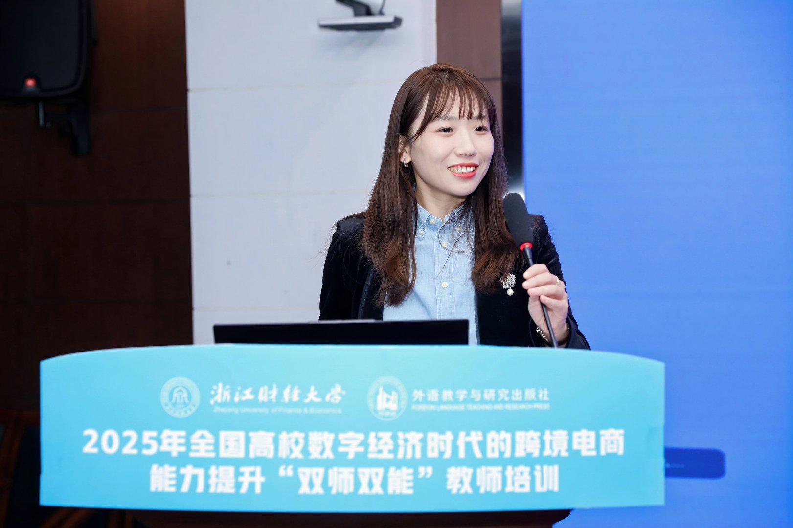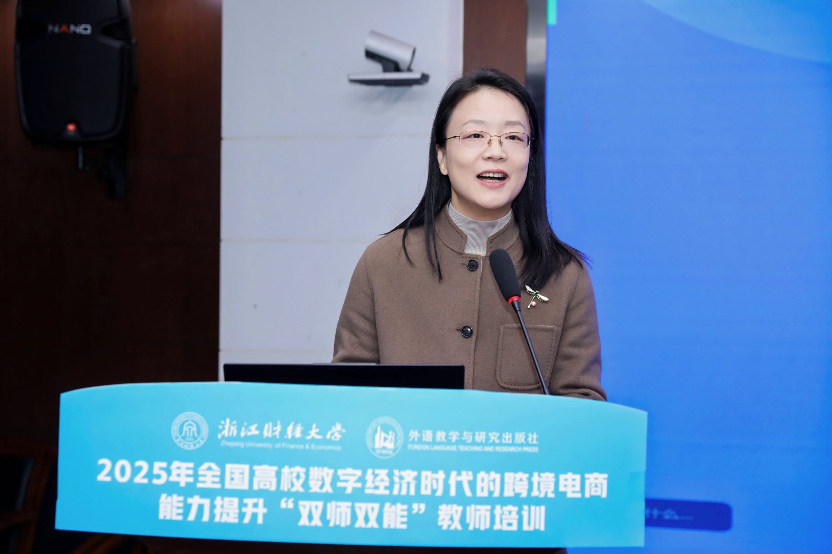 外研社高等营销中心总监助理兼华中营销大区总经理翟嘉琪致辞,她指出,外研社始终致力于推动“外语+专业”的融合发展和产教协同育人,已构建起从教材、课程、评价到实训、师资、实习的一体化综合解决方案,本次培训旨在通过外语应用+跨境电商实操共同探索外语教育服务跨境电商发展的新路径。她呼吁全体教师以此次研修为契机,积极行动,共同为培养服务国家战略的高素质外语人才贡献力量。