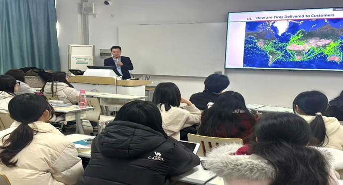为深化校企协同育人机制,将行业前沿实践与课堂理论教学深度融合,12月12日,我院商务英语系23级《国际贸易实务》课堂迎来了一场别开生面的“企业精英进课堂”活动。来自浙江财经大学---中策橡胶集团员工商务英语培训班的两位学员---杭州中策物流有限公司的朱秀凤女士与周灏先生,以企业实战专家的身份走进课堂,为同学们带来国际货物运输与国际物流领域的沉浸式分享。