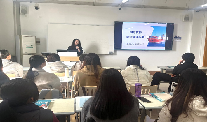 课堂上,两位企业精英凭借多年深耕国际物流领域的丰富经验,以英文授课的形式,将抽象的专业知识与生动的企业案例相结合,层层深入解析国际货物运输的实际操作流程、物流业务的核心环节与关键控制点。从产品生产端的仓储规划、报关报检流程,到运输途中的航线选择、风险防控,再到终端客户的交付服务,他们以清晰的逻辑、流利的专业英文表达,完整呈现了国际物流全链条的运作模式,让课堂呈现出理论与实践、语言与专业深度融合的独特魅力。