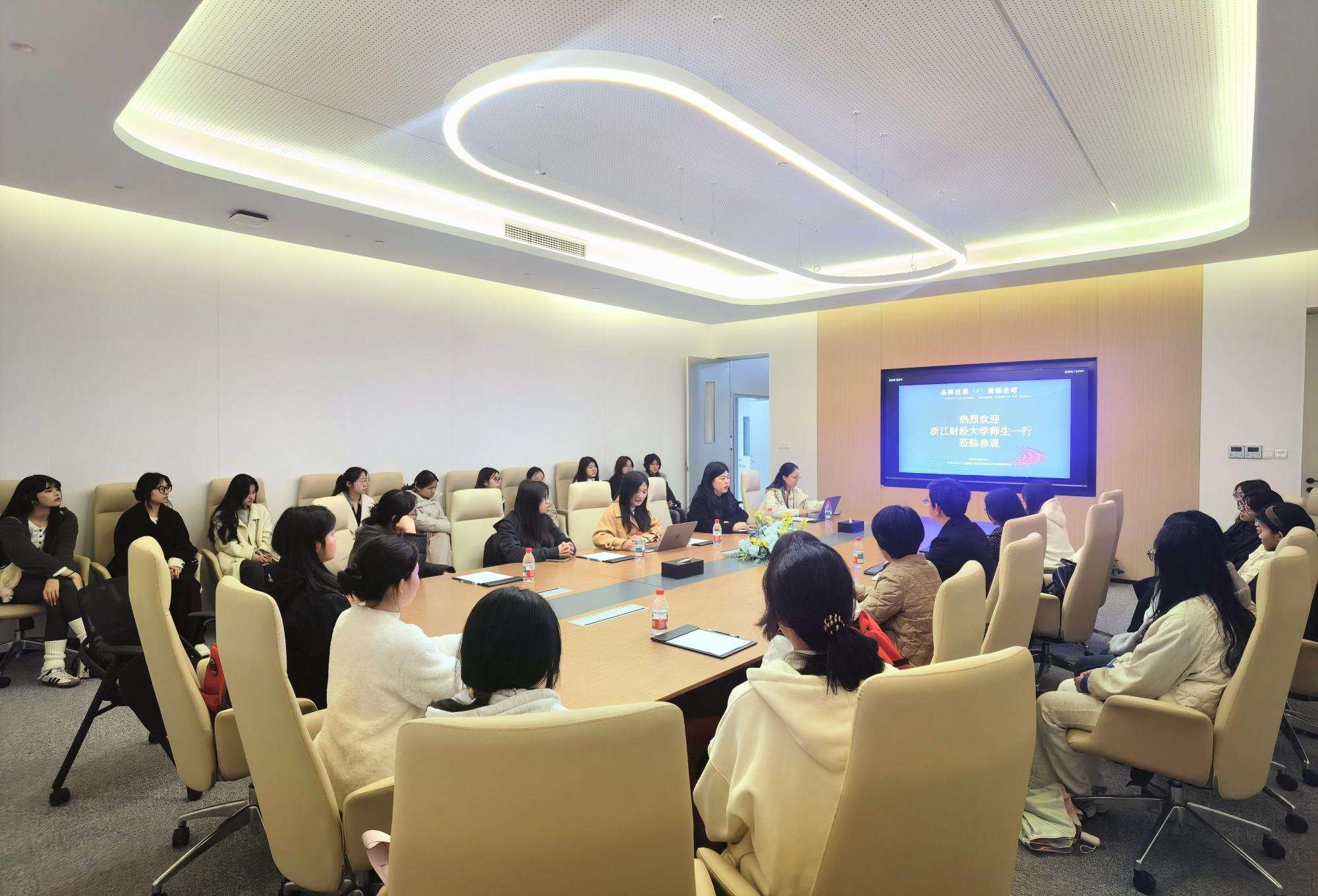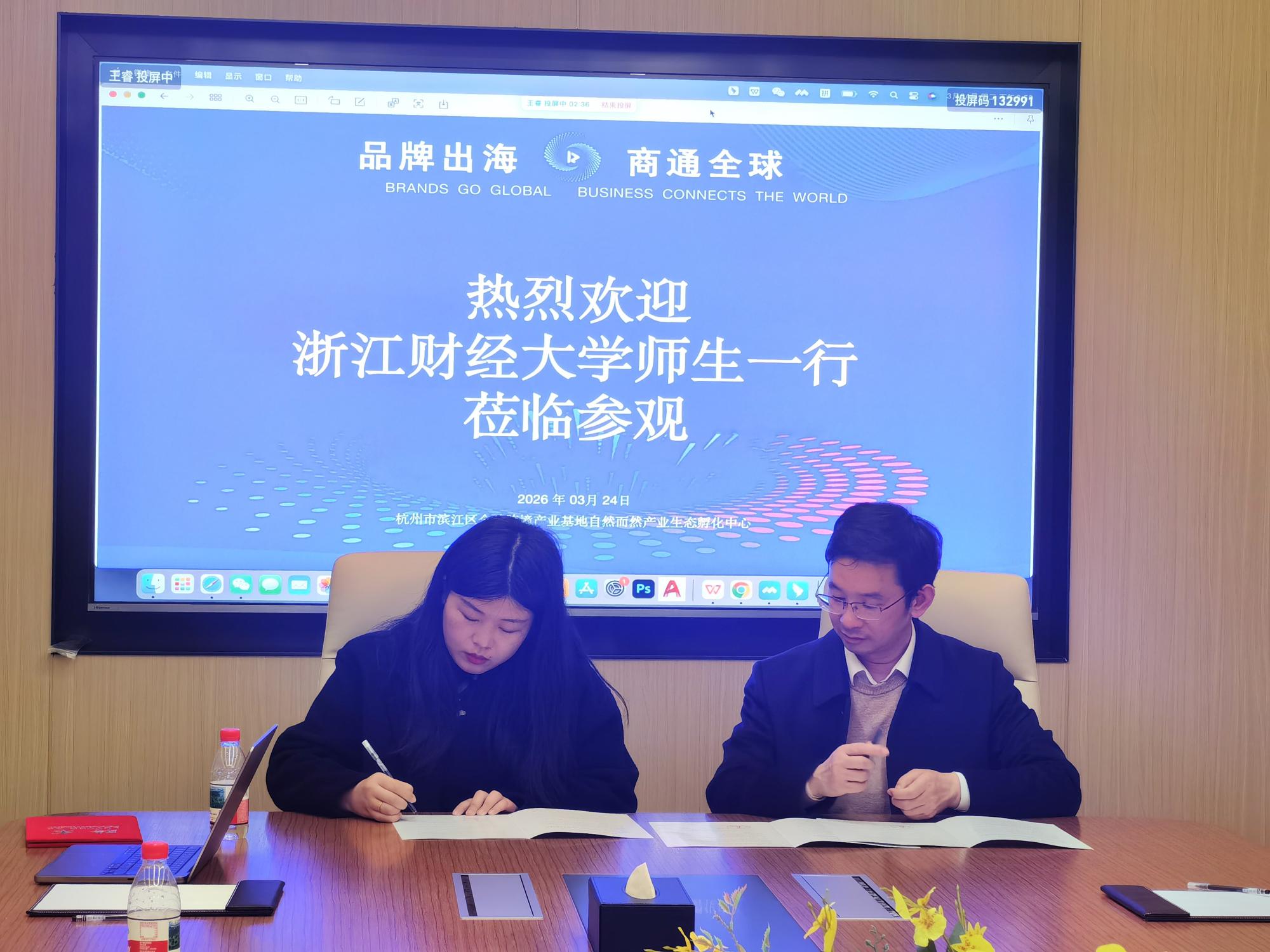 为深化产教融合、推进实习基地建设,推动人才培养与产业需求精准对接,2026年3月24日,浙江财经大学外国语学院副院长熊建国带队,英语系主任陈淑莹和商务英语系主任黄彬瑶随同,组织英语、商务英语专业本科生及硕士研究生近30人,赴浙江自然而然科技集团有限公司开展访企拓岗活动,并签署产教融合实习基地协议。自然而然公司总裁刘晓庆、跨境孵化中心商务经理兼政商协负责人胡丽赟、跨境孵化项目负责人王睿等公司高管热情接待了师生一行。