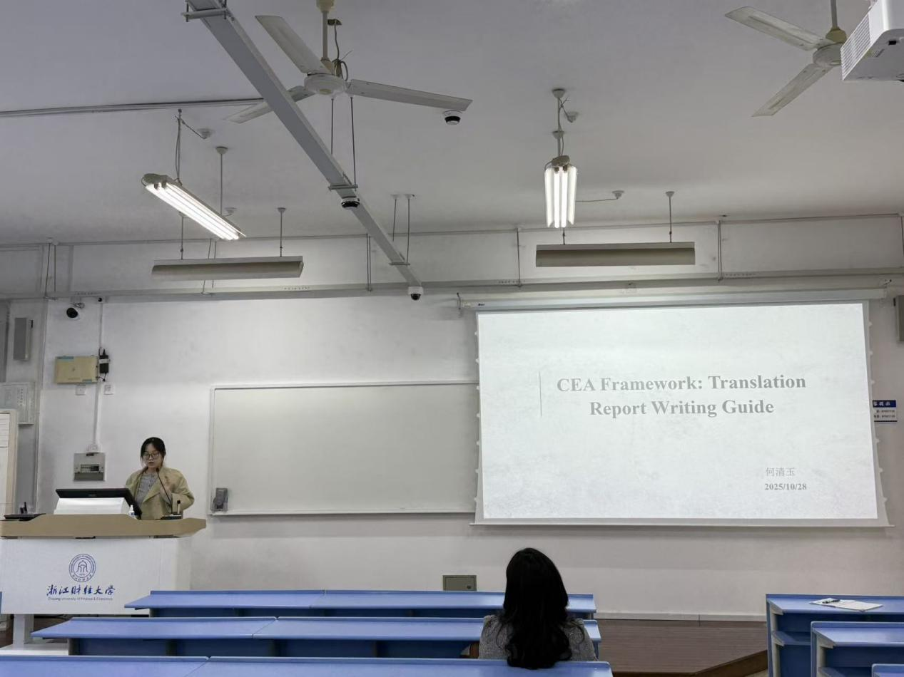 何清玉作了标题为“CEA Framework”的读书报告,围绕翻译实践报告的“CEA框架”展开。内容主要分为两大部分:一是深入解读CEA(理解、表达、变通)这一核心框架的内涵与操作步骤;二是结合书籍中的范文与点评,通过具体实例来演示该框架的实际应用,从而展现其对提升报告撰写质量的创新性与重要价值。
