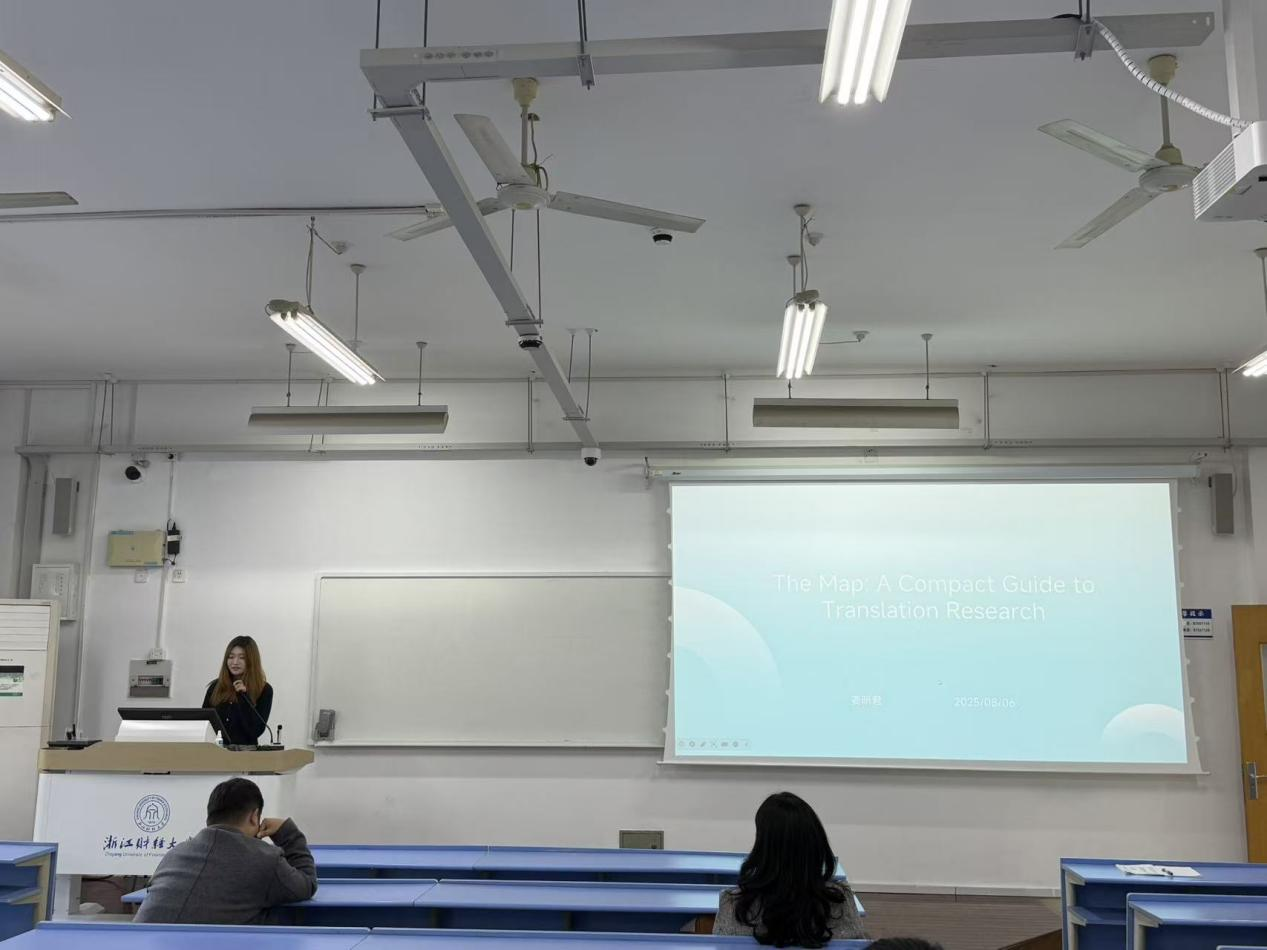 姜明君作了标题为“The Map: A Compact Guide to Translation Research”的读书报告,以“《翻译研究指南》的理论框架与研究方法”为主题,详细介绍了《The Map》一书作为翻译研究入门指南的内容结构、三大理论模型及研究方法分类,系统梳理了从选题到成果评估的完整研究流程。