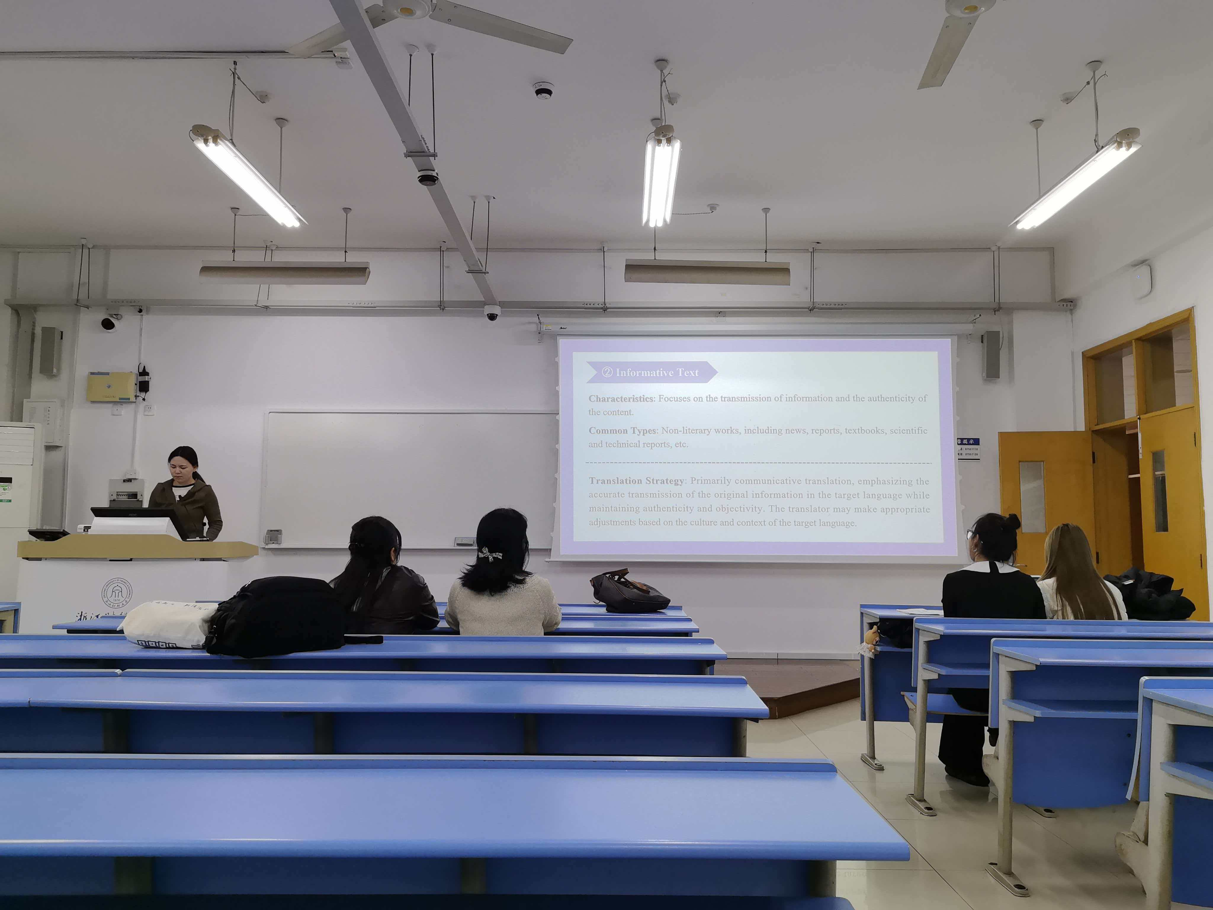 王美洁作了标题为“Applying Newmark's Theory of Text Types to The Translation of Financial Texts”的读书报告,以“纽马克文本类型视角下的金融翻译实践”为主题,详细介绍了纽马克三大文本类型(表达型、信息型、呼唤型)在金融语篇中的具体分布与翻译策略,并通过年报、评论、推介三类案例示范语义/交际翻译的取舍与融合。
