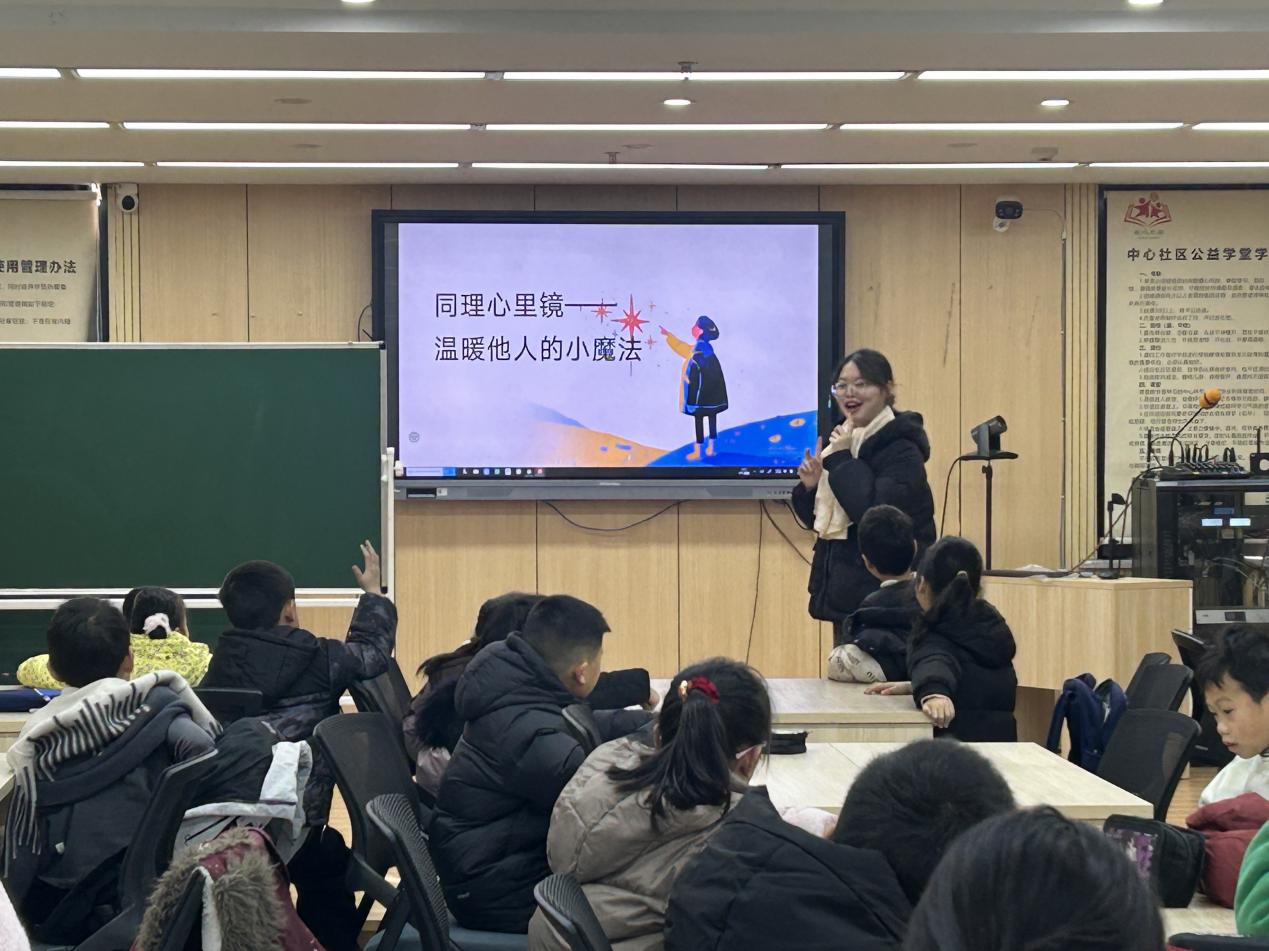 2024级商务英语专业学生毛玉婷担任“社区寒假公益学堂·爱心托班”辅导人,全程守护孩子们的安全与成长。从晨光迎接到暮色护送,她耐心辅导寒假作业,更在“时间胶囊”、同理心课堂、汉字溯源文化实践、食品安全科普等主题活动中巧妙引导,用创意点亮孩子们的寒假生活。