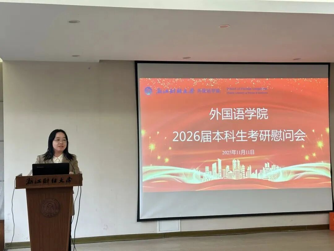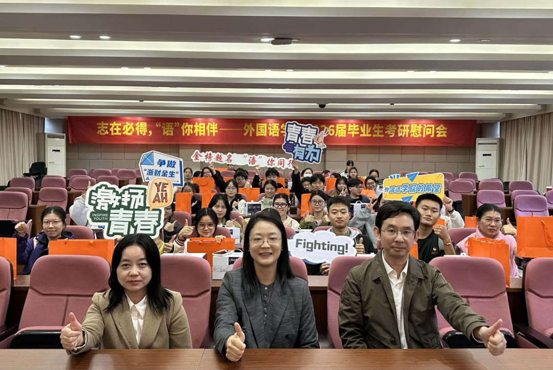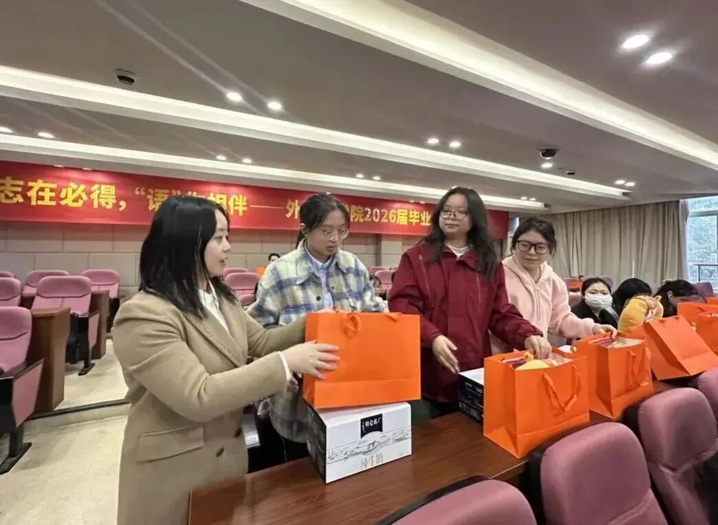 为进一步加强外国语学院学风建设,营造勤奋向上的学习氛围,鼓舞2026届考研学子的奋斗热情,助力同学们科学高效复习、调整备考心态。11月11日下午,外国语学院在8108举办“志在必得,语你相伴”考研慰问活动。党委书记王景、党委副书记张莲、副院长熊建国及毕业班辅导员到场慰问,活动由张莲主持。